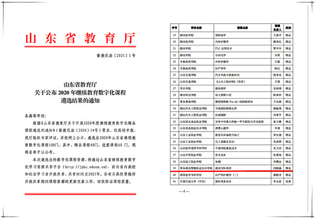 Three courses are selected as the digital courses of continuing education according to the notice on announcing the selection results of digital curriculum for continuing education in 2020 issued by Shandong Provincial Department of Education on January 10.