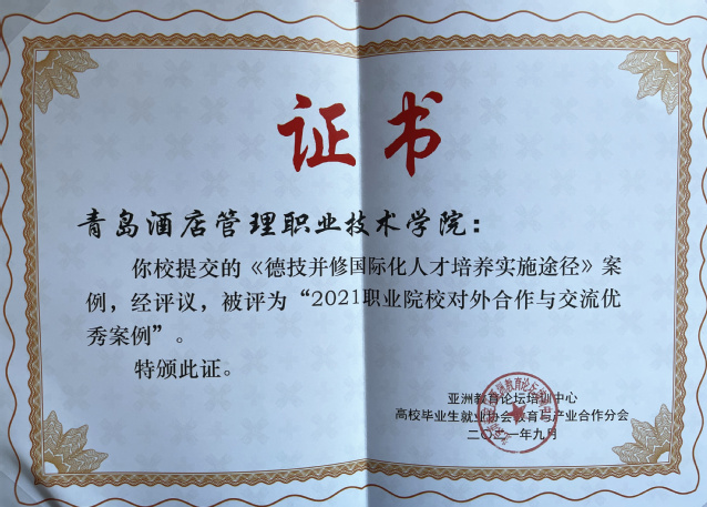 The forum selected the 2021excellent cases of foreign cooperation and exchange of vocational colleges. The case of the college's implementation approach to the cultivation of international talents with both morality and technology was rated as 2021 excellent cases of foreign cooperation and exchange of vocational colleges., and was successfully selected into the compilation of typical cases of International cooperation in vocational education. International and domestic mainstream media and educational media will publicize and report excellent cases which will further enhance the popularity and influence of the college.