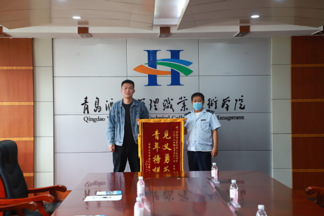 Zhu Hai, a student of the School of Hotel Engineering, was presented with a gratitude flag for his courageous deeds by the 2nd Shinan Branch of Qingdao Bus Group. The flag is entitled Youth Model for Courageous Deeds to thank him for his courageous action to save the bus driver on the afternoon of September 24.